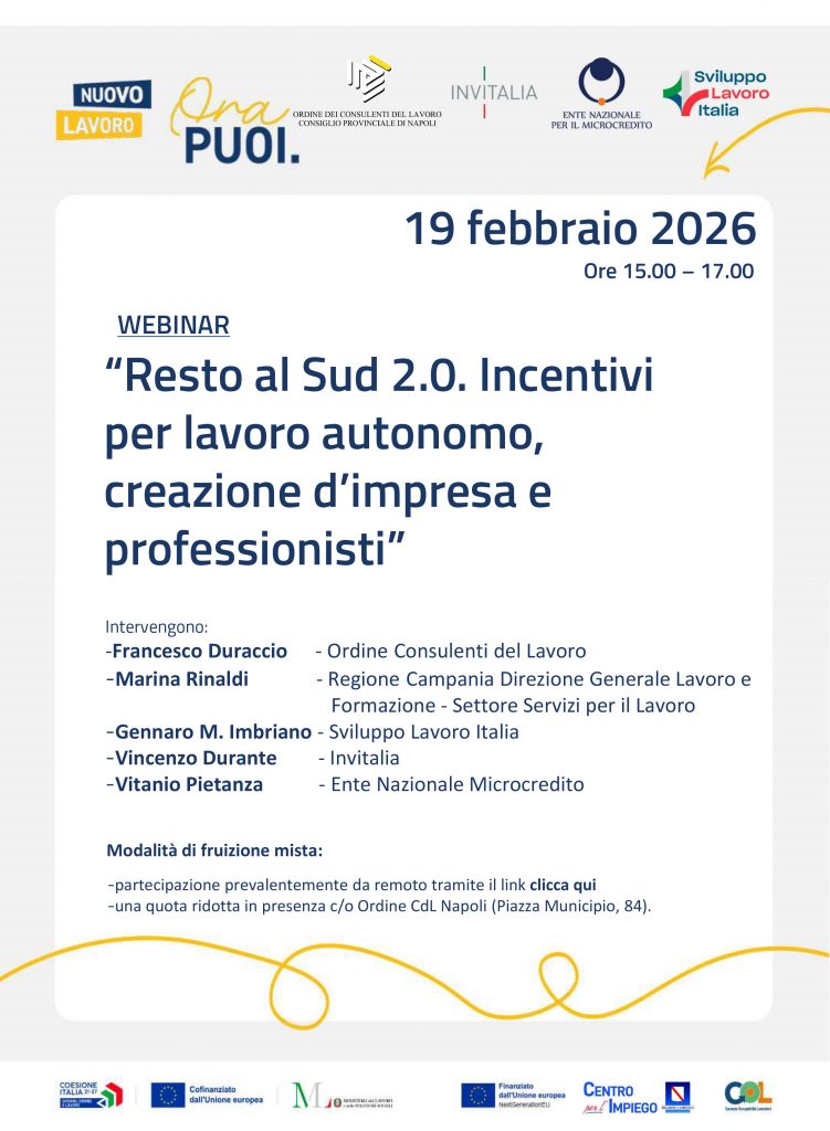 Il Consiglio Provinciale dei Consulenti del Lavoro ha organizzato per giovedì 19 febbraio, ore 15.00-17.00, un incontro su strumenti di sostegno all’autoimpiego e all’autoimprenditorialità, in webinar Zoom e con posti limitati in presenza (Piazza Municipio 84 – Sala Edmondo Duraccio).