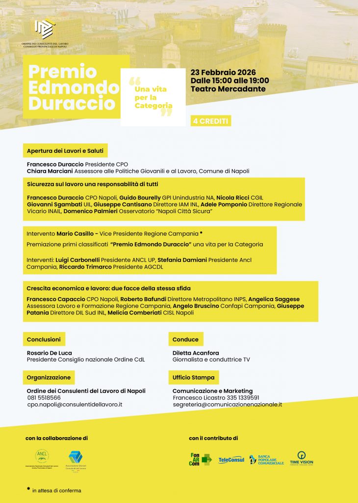 Siamo pronti per la Terza Edizione del Premio Edmondo Duraccio – Una Vita per la Categoria, il grande evento annuale dedicato ai Consulenti del Lavoro, che si terrà nella prestigiosa cornice del Teatro Mercadante di Napoli, lunedì 23 febbraio dalle ore 15:00 alle ore 19:00.