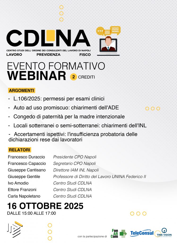Il Centro Studi dell’Ordine dei Consulenti del Lavoro di Napoli ha organizzato il prossimo evento formativo che si svolgerà in modalità webinar sulla piattaforma ZOOM del CPO di Napoli il prossimo 16 ottobre dalle ore 15:00 alle ore 17:00 e tratterà i seguenti argomenti: